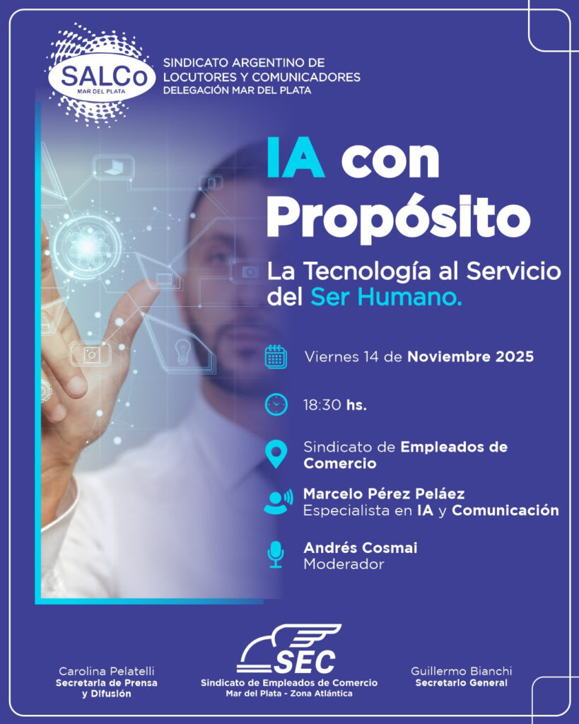 El Sindicato de Empleados de Comercio y el Sindicato Argentino de Locutores y Comunicadores (SALCo) anunciaron la realización de la charla abierta “IA con Propósito: La tecnología al servicio del ser humano”, prevista para el viernes 14 de noviembre a las 18:30 hs. El evento se desarrollará en la sede del Sindicato de Empleados de Comercio, ubicada en Salta 1852, Mar del Plata.