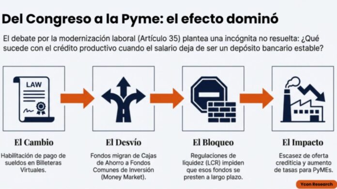 El debate en el Congreso por el artículo 35 de la reforma laboral, que habilita el pago de haberes en billeteras virtuales, reactivó una discusión central para el financiamiento productivo: el efecto que un cambio de canal puede tener sobre los depósitos bancarios y, por extensión, sobre el crédito a pequeñas y medianas empresas.