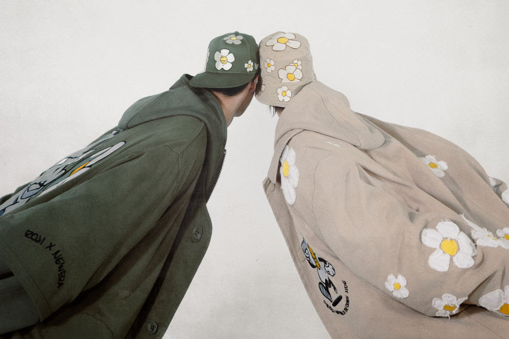 El desarrollo se extiende a dos prendas: un jersey de béisbol en la paleta cromática de la colección, y una coach jacket en beige, decorada con las flores distintivas del artista. Además, la propuesta suma un llavero de FFALO, Art Toy insignia de la marca, originado en Corea del Sur junto al colectivo artístico Hands In Factory, y un llavero en forma de mini gorra, inspirado en el diseño exclusivo presentado en la ComplexCon 2025 en Las Vegas.