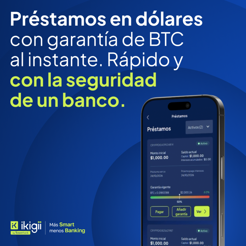 Ikigii incorporó préstamos en dólares con garantía en Bitcoin, una herramienta que permite acceder a liquidez en USD a partir de la tenencia de BTC sin necesidad de vender el activo. El producto se gestiona íntegramente desde la aplicación y cuenta con el respaldo de Towerbank, banco regulado en Panamá y supervisado por la Superintendencia de Bancos.