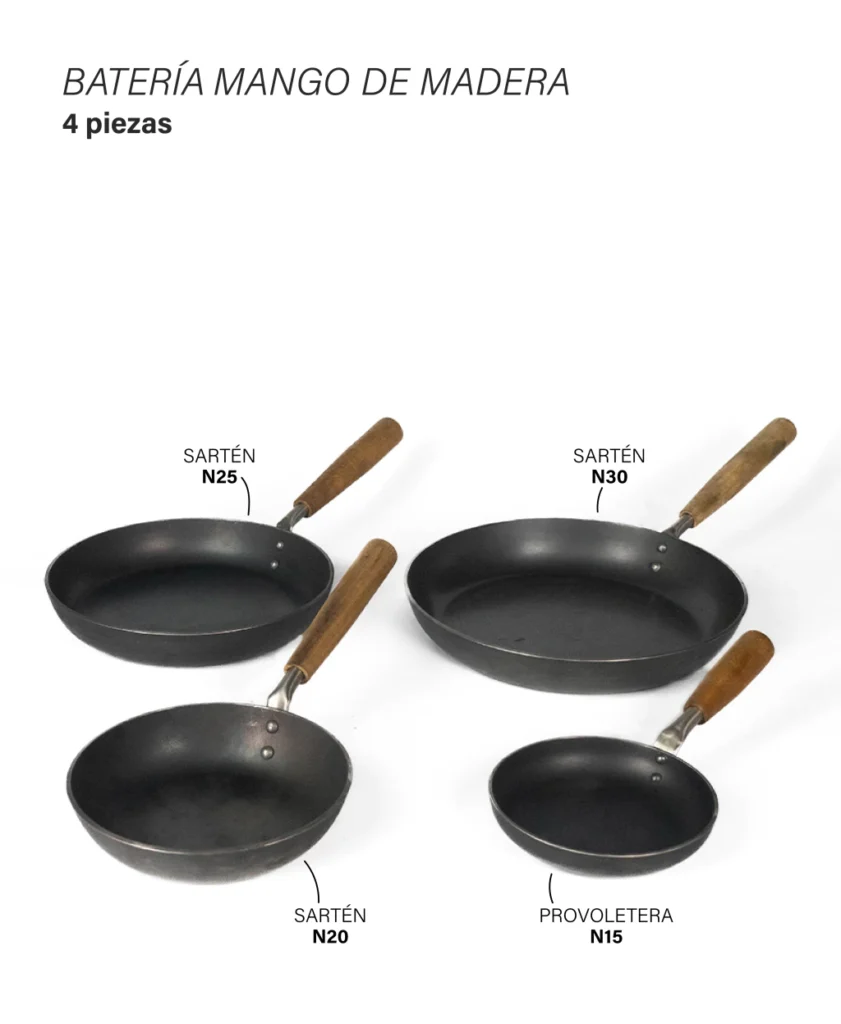 Las sartenes de Kankay se fabrican en hierro laminado en caliente, material que les confiere resistencia y favorece una distribución eficiente del calor. Para obtener el mejor rendimiento, la compañía recomienda curar los productos antes del primer uso.