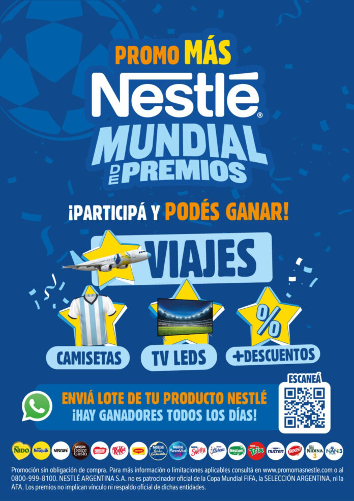 Nestlé lanzó la “Promo Más Nestlé: Mundial de Premios”, una iniciativa multimarca y federal que propone participar por premios a través de WhatsApp durante 60 días. La acción combina premios instantáneos —televisores, camisetas y descuentos— con un premio mayor: dos viajes a Dallas (EE.UU.) todo pago.
