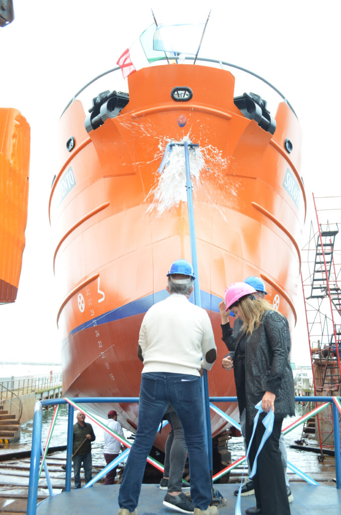 La ceremonia culminó con el tradicional bautismo del buque, realizado por Virginia Ferrer, madrina de la embarcación, quien estrelló una botella de champagne contra el casco antes de que el “Sotavento” iniciara su navegación en el Mar Argentino.