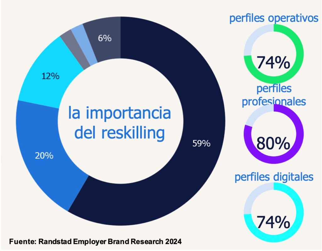 El estudio de Randstad también analiza la importancia del reskilling según el perfil profesional de los trabajadores. Los resultados muestran que este aspecto cobra más relevancia entre los perfiles profesionales en el 80% de los casos, mientras que entre perfiles operativos y los perfiles digitales tiene una valoración levemente menor (74% en ambos casos).