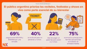 En términos de experiencia, también se destaca una madurez en el consumo cultural: el 93% de las personas no tiene problema con que se limite el uso del celular durante los shows, valorando más el disfrute real que el registro digital. Las experiencias por las que más están dispuestos a pagar los argentinos son el acceso VIP y los meet & greet, lo que refuerza la idea de que el público busca mucho más que un ticket: quiere recuerdos inolvidables.